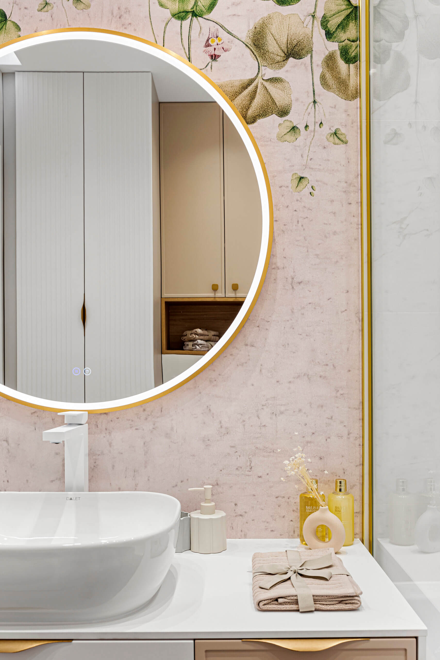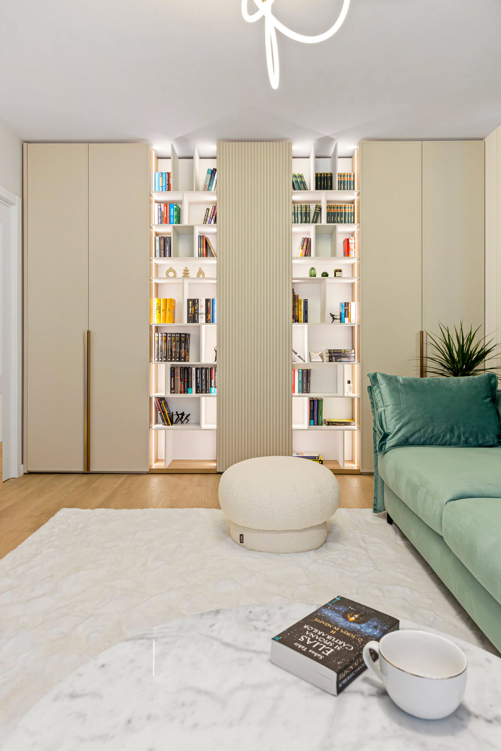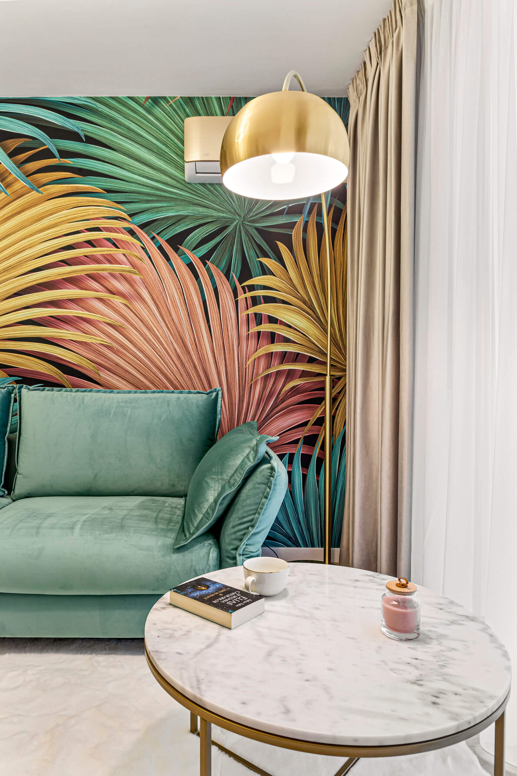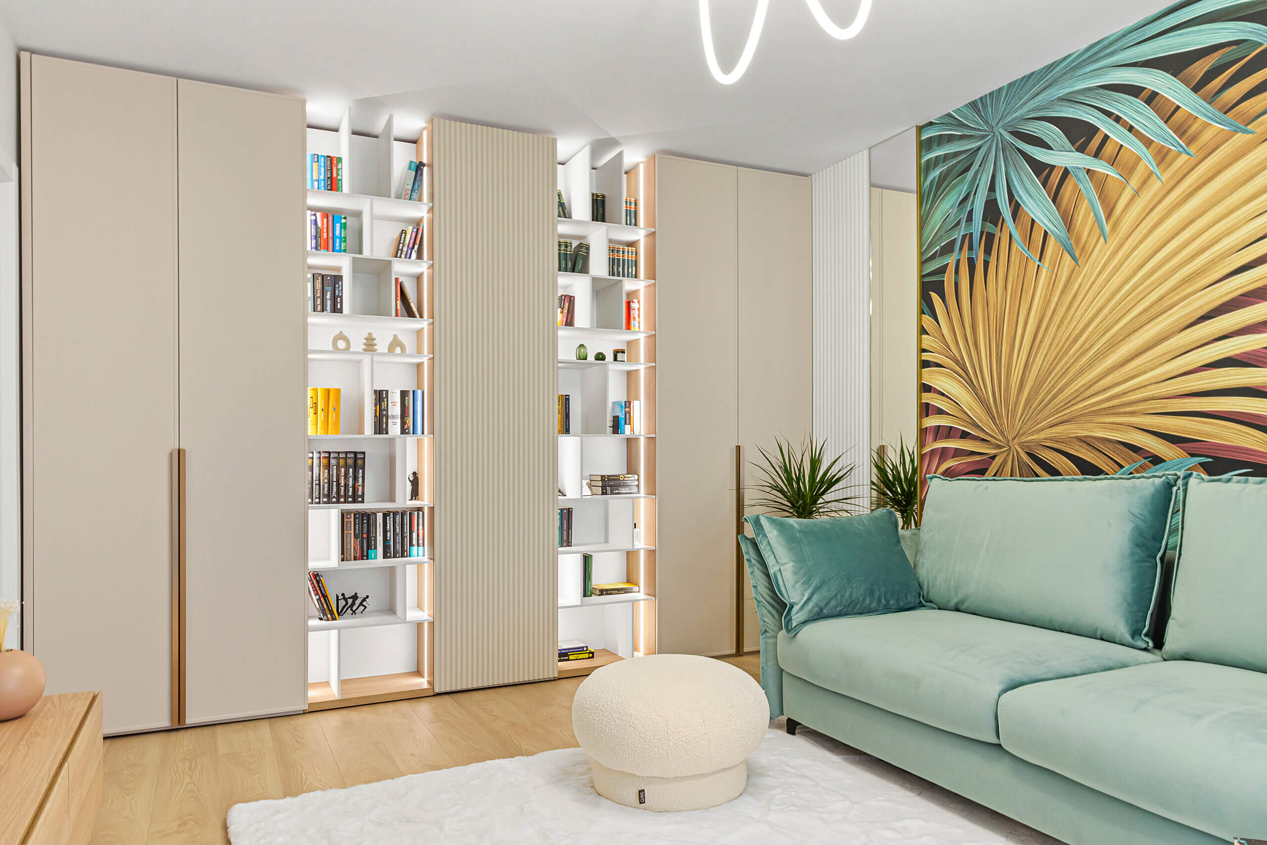 Intregul proiect a fost conturat in jurul elementelor naturale, care se regasesc deopotriva prin decoratiunile de plante naturale si prin peretii cu design biofilic prezenti in living, dormitor si baie.