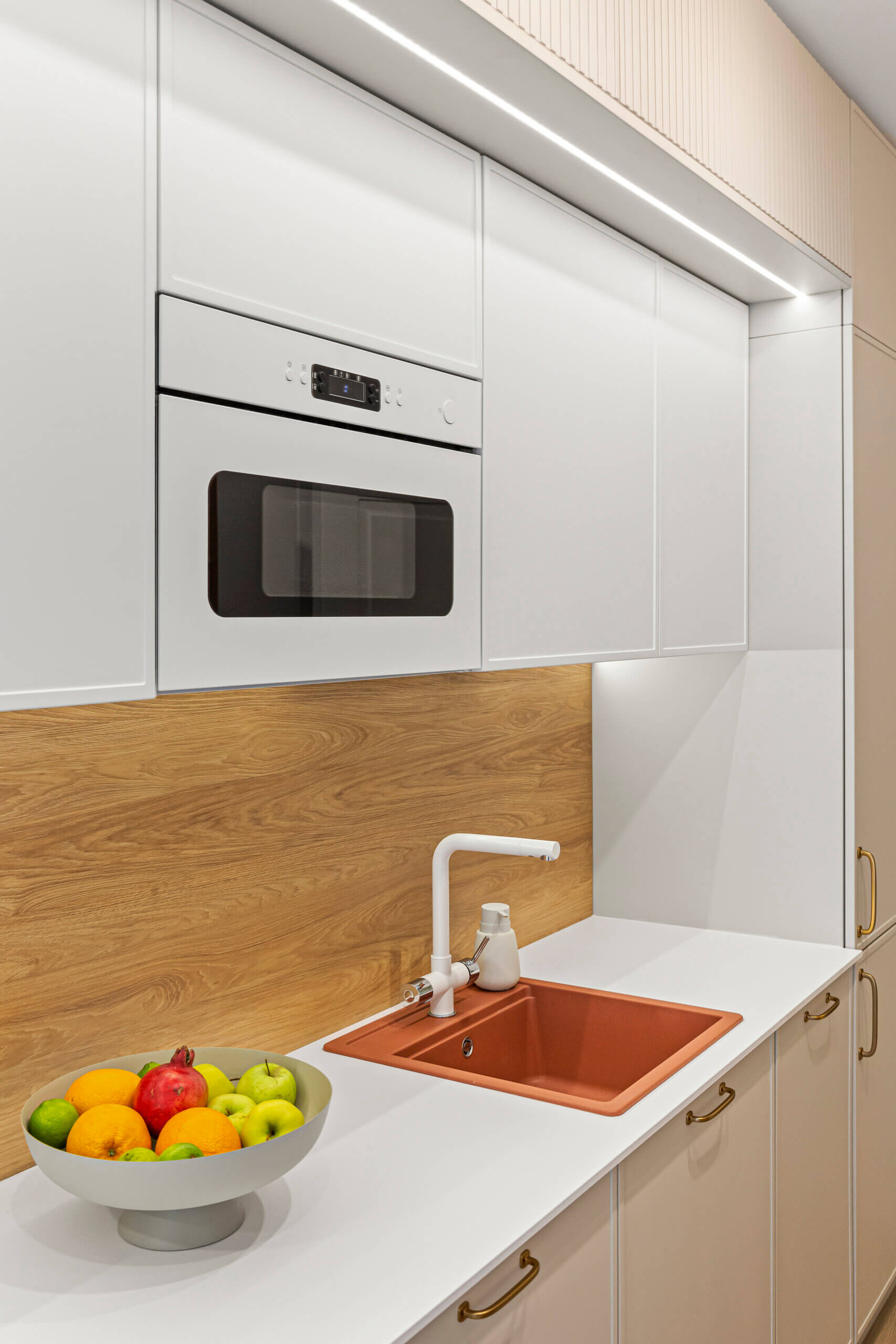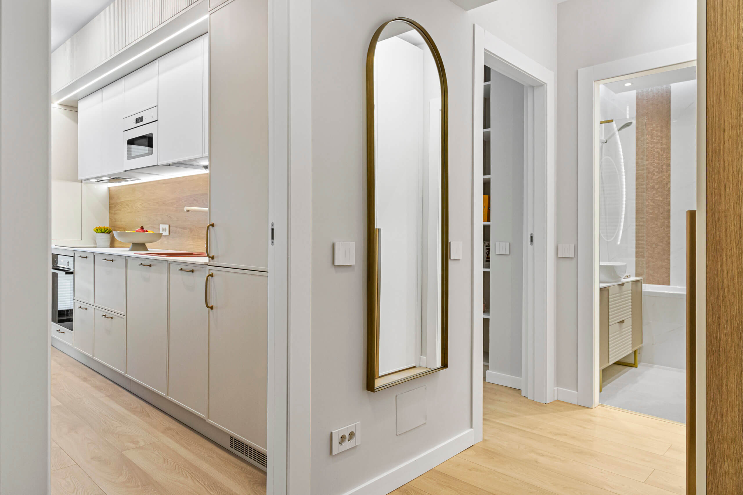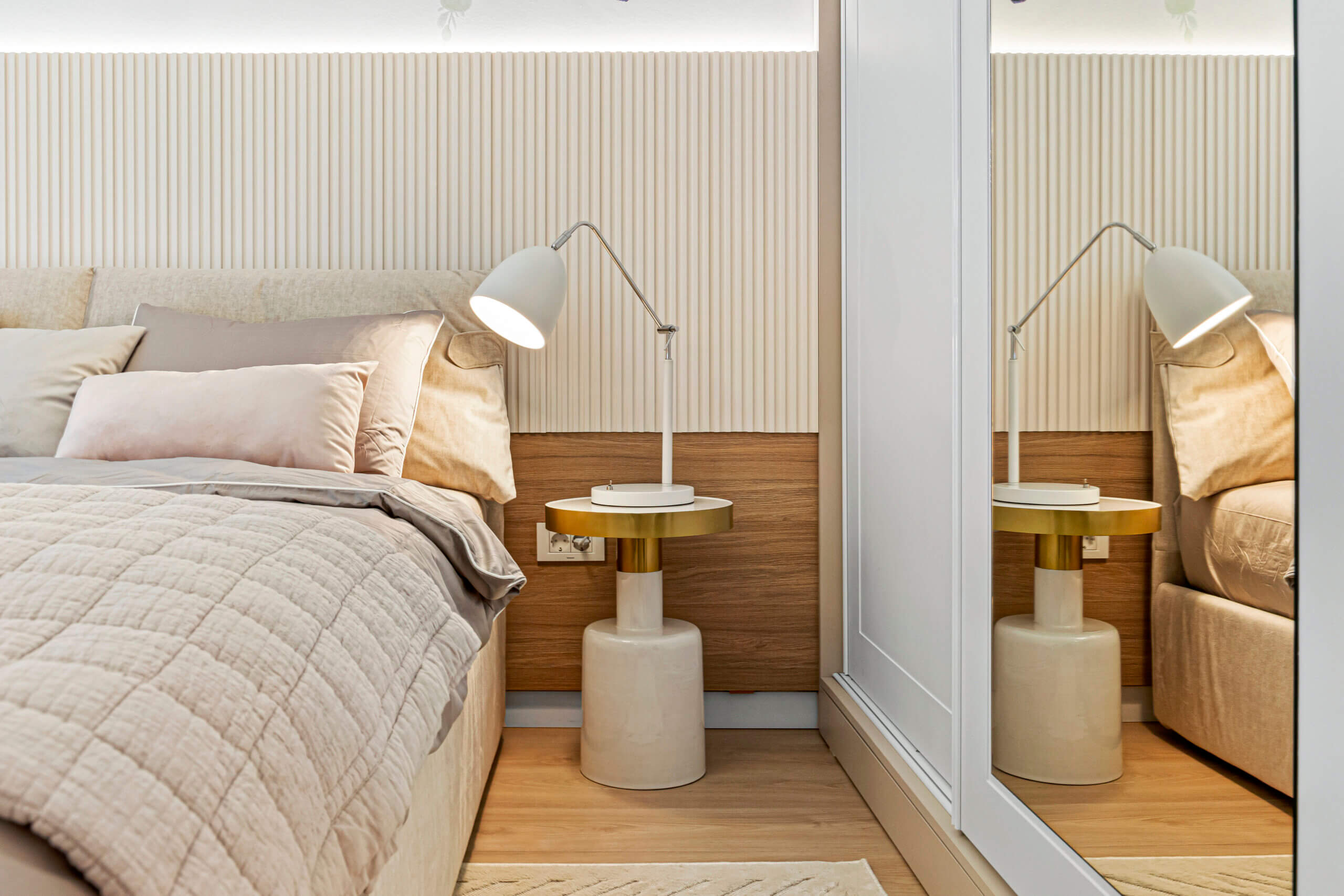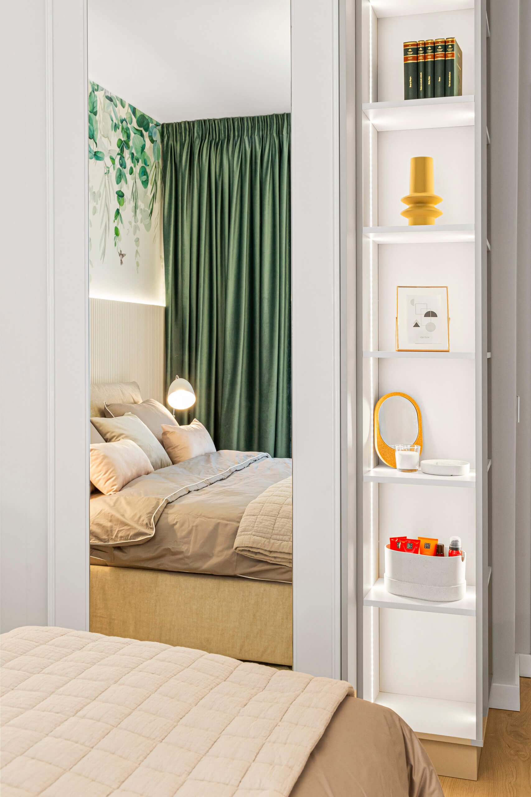 Intregul proiect a fost conturat in jurul elementelor naturale, care se regasesc deopotriva prin decoratiunile de plante naturale si prin peretii cu design biofilic prezenti in living, dormitor si baie.