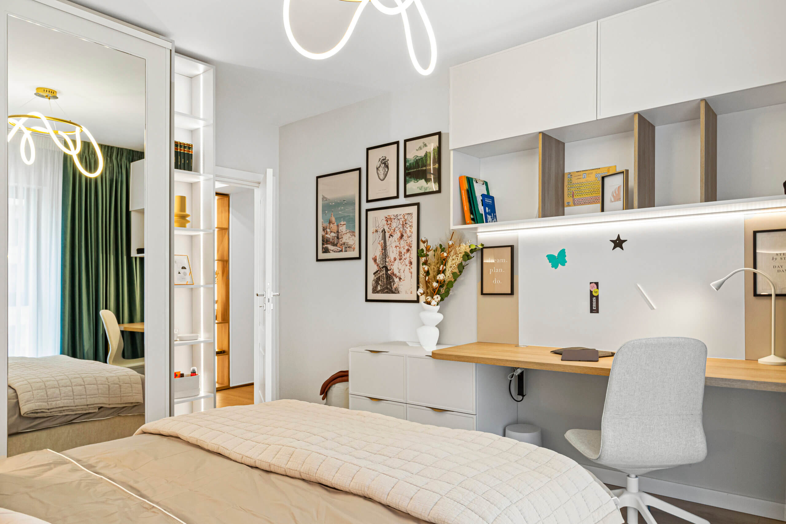 Fiind vorba despre o beneficiara care isi petrece cea mai mare parte a timpului studiind, dormitorul a capatat o dubla utilitate – de odihna dar si de studiu – cromatica folosita fiind una propice celor doua tipuri de activitati. In zona de zi si bucatarie s-a folosit o serie de contraste mai puternice, pentru a scoate in evidenta energia si spiritul tanar al beneficiarei, pastrand in continuare aceleasi note cromatice.