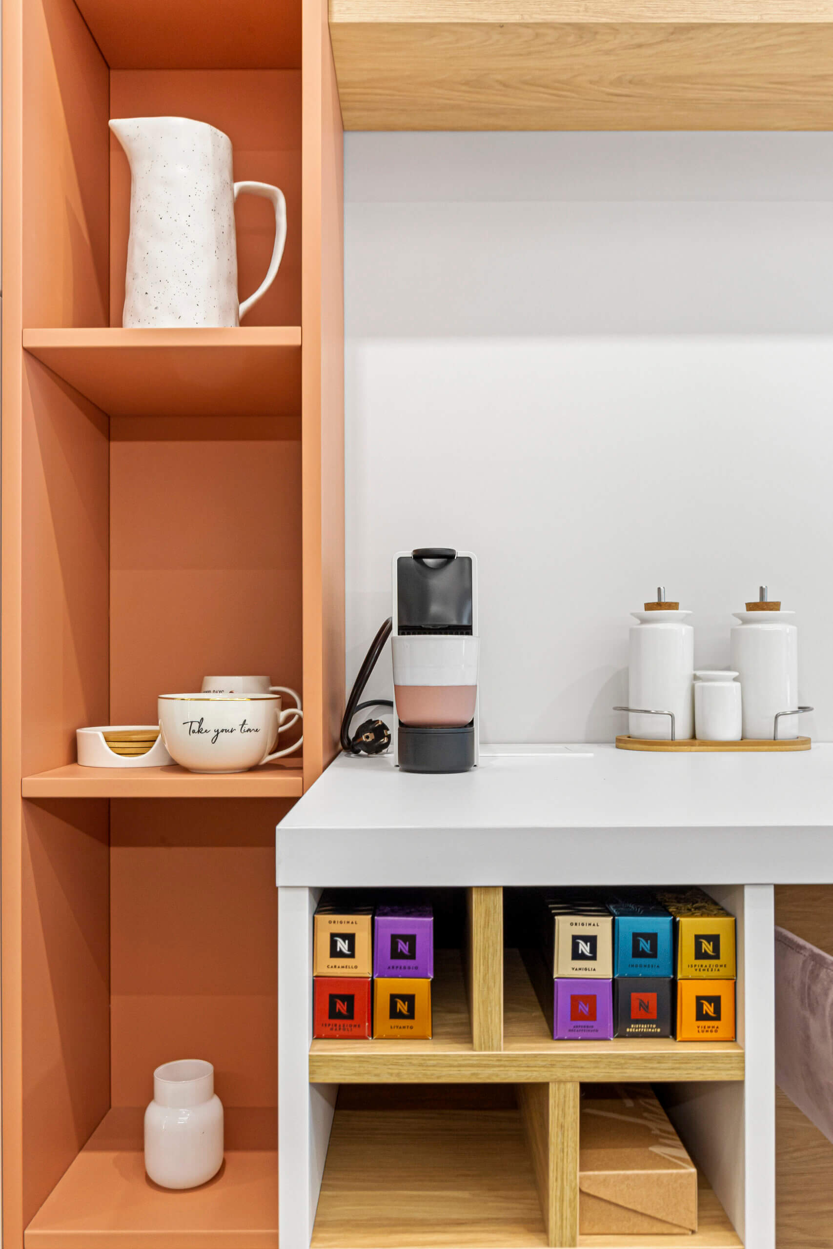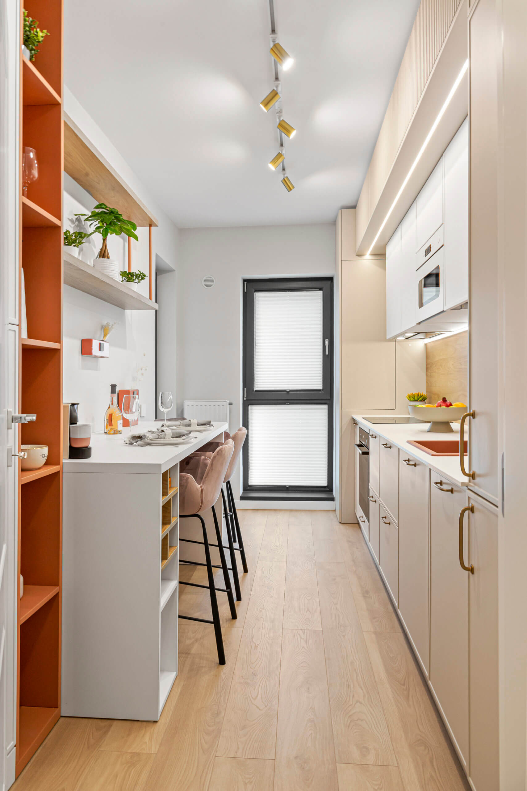 Fiecare zona a casei a fost minutios gandita atat functional, cat si estetic, au fost create nenumarate spatii de depozitare in ciuda suprafatei relativ reduse a apartamentului de numai 50 mp.